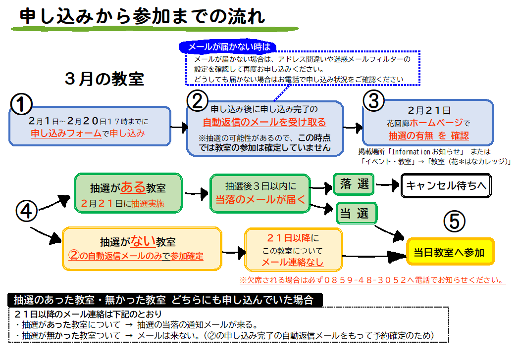 こちらの教室については抽選を実施しません。2/1~2/20(17時締切)の間にお申し込みされた方は、申し込み直後に届いた自動返信メールをもって予約確定となります。2/21以降に花回廊から当落のメール連絡はいたしません。当日会場にお越しください。