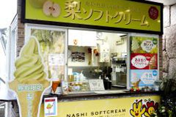 鳥取県特産、湯梨浜町の梨の果汁をたっぷりと濃縮した梨ソフトクリーム。リッチなバニラとのハーモニーは格別のおいしさです。